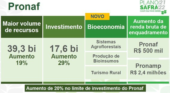 No Plano 2021/22, os recursos (custeio, comercialização e investimento) destinados à agricultura familiar tiveram crescimento em 19%. Serão destinados R$ 39,34 bilhões para financiamento pelo Pronaf, com juros de 3% e 4,5%. Desse valor, são R$ 21,74 bilhões para custeio e comercialização e R$ R$ 17,6 bilhões para investimentos.