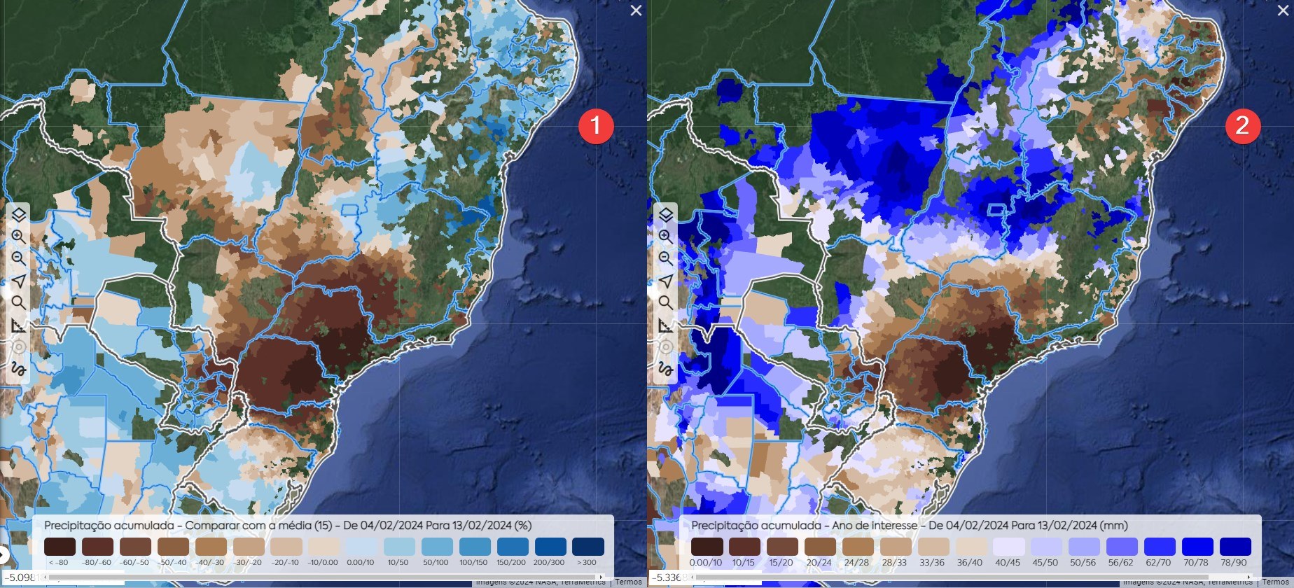 No Mato Grosso, a umidade do solo encontra-se em patamar superior em fevereiro, em comparação com o último bimestre de 2023, quando teve início do ciclo da soja. No estado, a produtividade média estimada pela empresa para o milho segunda safra é de 112,3 sacas/hectare, 2% menor que na safra passada, mas 5,2% superior à projeção da Conab atualmente estima. Já para a soja, o analista de safra da EarthDaily Agro, Felippe Reis, esteve no sudeste do estado na última semana e verificou quebra de mais de 70% nas áreas plantadas em setembro e de 10% a 20% nas lavouras semeadas a partir de novembro. Segundo ele, outras áreas no centro do estado deverão apresentar resultado menos desfavorável, mas ainda ruim. A quebra estimada no estado deve chegar a 17,6% sobre a safra passada, com produtividade média de 51,8 sacas/hectare.