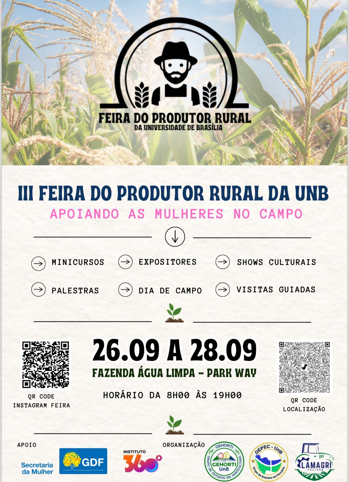 Com o tema “Apoiando a Mulher no Campo”, a feira tem o objetivo de promover o conhecimento, possibilitar a união entre teoria e prática por meio de minicursos, palestras, dia de campo, mesas redondas, exposição de produtos agropecuários, além de produtos frescos e de qualidade que estarão à venda, produzidos diretamente pelo produtor rural. As atividades serão ofertadas de forma gratuita a toda a comunidade brasiliense.