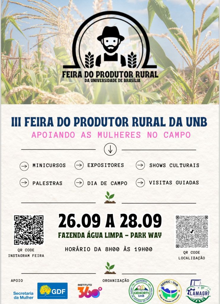 A III Feira do Produtor Rural da Universidade de Brasília (UnB) vai reunir, na Fazenda Água Limpa – campo experimental da UnB, alunos, professores, expositores, visitantes e produtores nas atividades que serão ofertadas – gratuitamente – durante os três dias de realização da Feira.